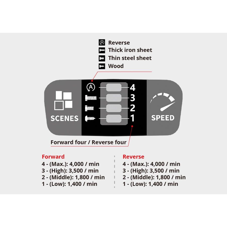 | Drehzahl (RPM) | 0-1200 / 0-1900 / 0-2500 / 0-3200 |