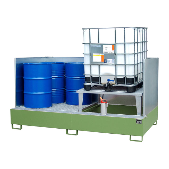 Produktbeschreibung:Lagerung von IBC à 1000 Liter, auch mit Fässern (60/200 Liter) und Kleingebinden kombinierbarHauptmerkmale: Konstruktion aus 3 mm Stahlblech 100 mm Unterfahrhöhe Abfüllaufsatz Verzinkter Gitterrost (Tragfähigkeit 1000 kg/m²) Spritzschutzwand 3-seitig aus verzinktem Stahlblech, 1000 mm hoch Mit Übereinstimmungserklärung (ÜHP) gem. StawaR Zugelassen für entzündbare Flüssigkeiten der GHS-Kategorien 1-3 Zugelassen für gewässergefährdende Flüssigkeiten der GHS-Kategorien 1-4 Anwendungsbereiche: Ideal für den Einsatz in Industrie, Handwerk, Lager oder kommunalen Einrichtungen – überall dort, wo Sicherheit, Ordnung und Effizienz im Mittelpunkt stehen..