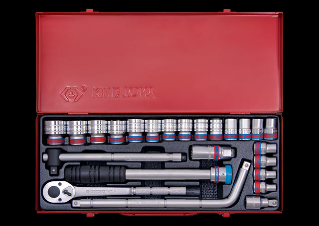 KING TONY Profi-Werkzeuge - 1/2" Steckschlüssel-Set, Zoll, mit Zubehör - 24 tlg. 4533SR Zubehör: Metallkiste Zubehör: 6-Kant Steckschlüssel Zubehör: widerstandsfähiger KING TONY Griff Zubehör: Ratsche mit 11° Rückschwenkwinkel Leere Box: 814533MR Abmessungen L x B x H (mm): 445x187x50 Gewicht (Kg): 5,7 Produktmerkmale: - Entwickelt für maximale Präzision und Zuverlässigkeit im täglichen Einsatz - Hochwertige Verarbeitung für dauerhafte Belastung im Profi-Umfeld - Ergonomisches Design für komfortable Handhabung auch bei längeren Einsätzen - Optimal geeignet für professionelle Anwender im Handwerk und in der Industrie Empfohlene Verwendung: Ideal für Werkstatt, Montageeinsätze oder Reparaturarbeiten mit höchsten Ansprüchen.