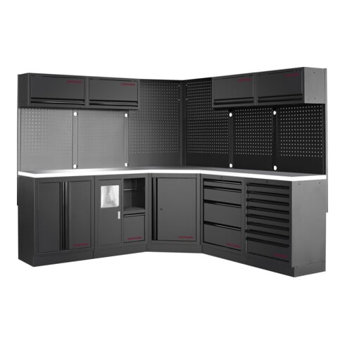 Die KRAFTWERK MOBILIO BLK 5er Eck-Kombi (KW-3964O-BLK-IX) bietet Dir die perfekte Lösung, um Deine Werkstatt strukturiert, effizient und stilvoll einzurichten. Mit 13 kugelgelagerten Schubladen, sechs Schränken, einer Lochwand für Werkzeug und einer 38 mm starken Arbeitsplatte aus Edelstahl 430 bekommst Du ein Komplettsystem für professionelle Ordnung. Die robuste, freistehende Konstruktion überzeugt durch maximale Funktionalität und modernes Design – ideal für Profis und anspruchsvolle Heimwerker.