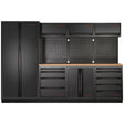 Kraftwerk Mobilio Werkstatteinrichtung, Werkbank Black Edition 4er Kombi mit 9 Schubladen, 5 Schränken, Vierkant-Lochwand, Arbeitsplatte Buche